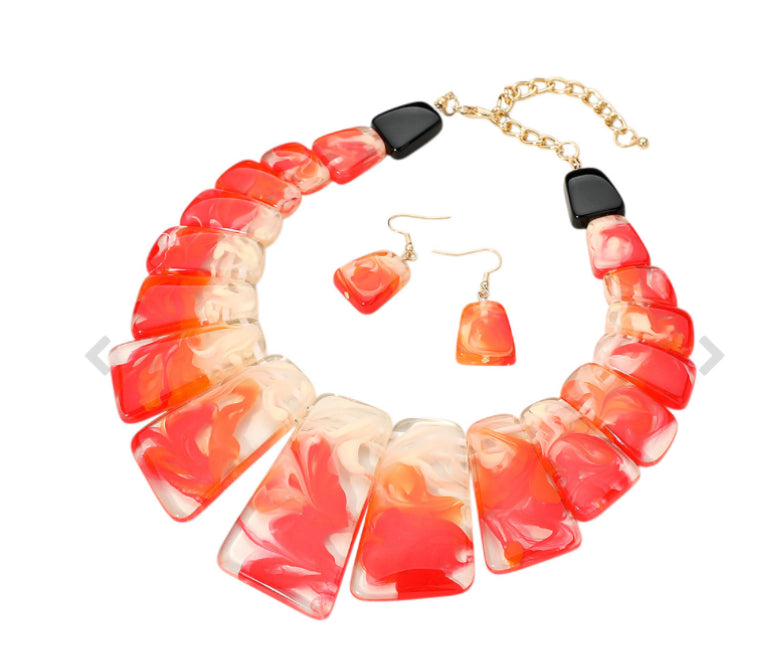 Geometric Celluloid Acetate Bold Plated Beaded Bib Statement Necklace w/ matching earrings